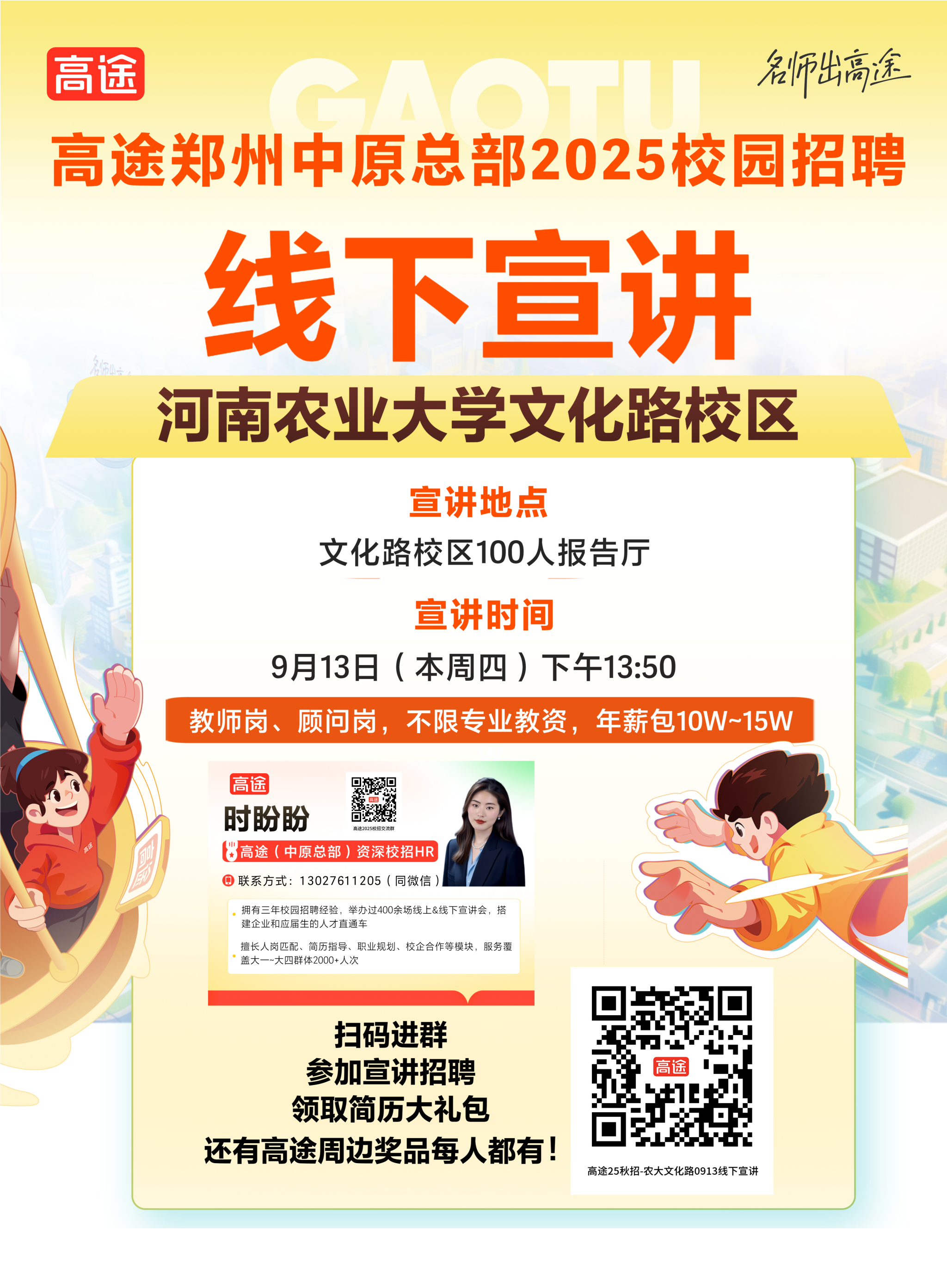 这里有你想要的高薪工作、双休六险一金、年轻人氛围、公平晋升、上市公司大平台,以及高途最大中心-郑州中心(自建高途办公园区),在职人数6000+,也有大量咱们的学长学姐们,欢迎学弟学妹们加入!
