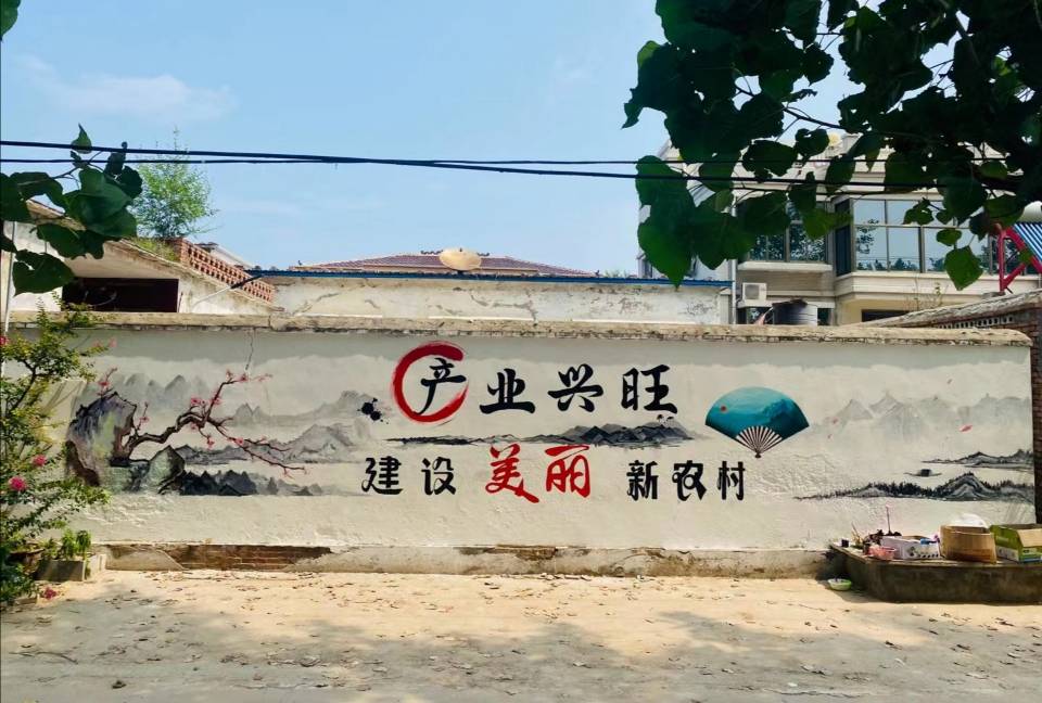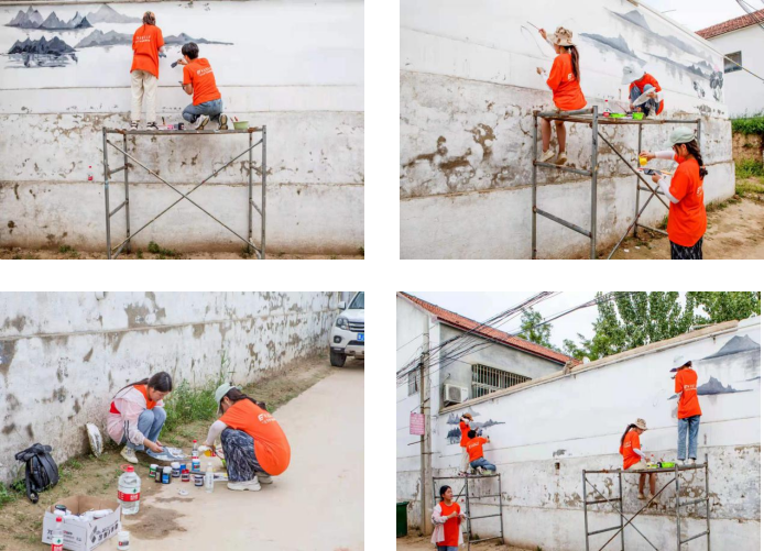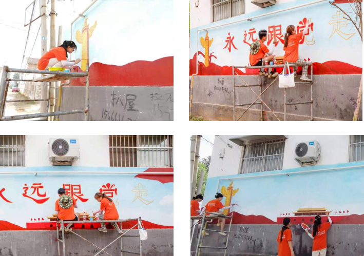7月12日,团队抵达目的地后首先对村内地理位置、墙绘风格进行考察,结合当地浓郁的黄河文化特色以及村民对美好生活的向往,团队决定以水墨画和党政宣传为主题进行绘画。活动中,团队秉持用画笔描绘美丽乡村、为乡村注入文化血液的理念,积极与当地村民进行交流,真正深入到农村生活的实践中了解乡村文化的发展现状和乡村振兴战略的实施情况。经过团队成员的深度了解、精心设计、反复打磨后,一幅幅生动活泼的墙绘作品呈现在了台前县的墙面上。图文并茂的墙绘,不仅易于被村民接受,提升了村庄的整体美观度,还营造了“敬党爱党”的良好氛围,使广大村民在潜移默化中接受优秀文化熏陶,进一步提升了群众的获得感和幸福感。