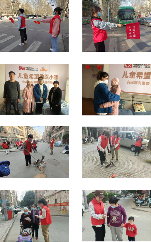 文化路上,志愿者同学们协助交管协警有序地引导着往来穿梭的机动车和行人,保障交通平稳有序。在农大社区里,同学们开展了社区环境治理活动,他们按照划分的区域对小区内道路、绿化带、宣传版面、健身器材进行清理,积极营造整洁优美、卫生干净的社区生活环境,同时还向老人儿童进行了安全知识普及。河南省儿童希望救助基金会助医小家中,我们的志愿者结合了自己的专业知识,向孩子介绍了绘画的基础知识,图文并茂地讲解了一些具体的技巧并带着孩子积极进行练习,过程中不仅让孩子收获了快乐,忘却了烦恼,让志愿者同学们更加意识到了助人为乐所能带给自己的快乐。母亲河岸边,一群身穿“红马甲”在绿色树丛中穿梭的志愿者同学们戴着手套,拎着黑色垃圾袋,在河滩边进行垃圾清理,用自己不怕吃苦不怕累的精神,为黄河的环境治理贡献了自己力量。