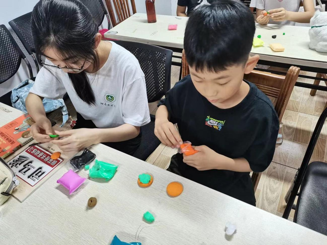 在雷锋站志愿者们的带领下,爱心课堂开展了趣味粘土手工活动。活动现场,我院青年志愿者悉心为孩子们提供思路与指导,开拓他们的思维,激发他们的创造力,现场氛围轻松活跃。随后,我院青年志愿者安排孩子们依次为大家讲述自己的劳动成果,许多栩栩如生的作品呈现在大家眼前。趣味粘土活动的开展,也教会了孩子们沟通、交流与分享,同时,锻炼了大学生志愿者对孩子的管理能力,这也为之后其他活动的开展积攒了经验与教训。活动在欢声笑语中结束。
