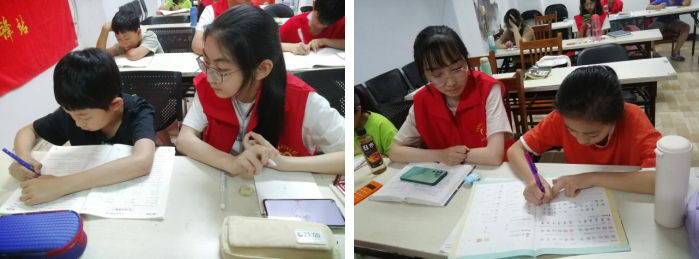 暑期爱心课堂活动分上午下午举行。活动中,7名大学生志愿者老师提前到达教室,帮助小朋友检查、批改作业,并给予耐心细致的讲解,以发掘、培养孩子们的兴趣为主要目的,更为广泛地拓宽了孩子们的兴趣范围。此外,志愿者老师还带领小朋友进行了书籍分享,为课堂融入开放性、创造性的元素,充分促进了孩子们想象力和能动力的发挥。最后,在志愿者老师的组织下,小朋友们依次上台发表自己的读书心得,交流自己的感受体会,锻炼了自己的语言表达能力。轻松诙谐的的授课方式和课堂氛围,让小朋友们感受到了同传统文化课不一样的课堂体验。