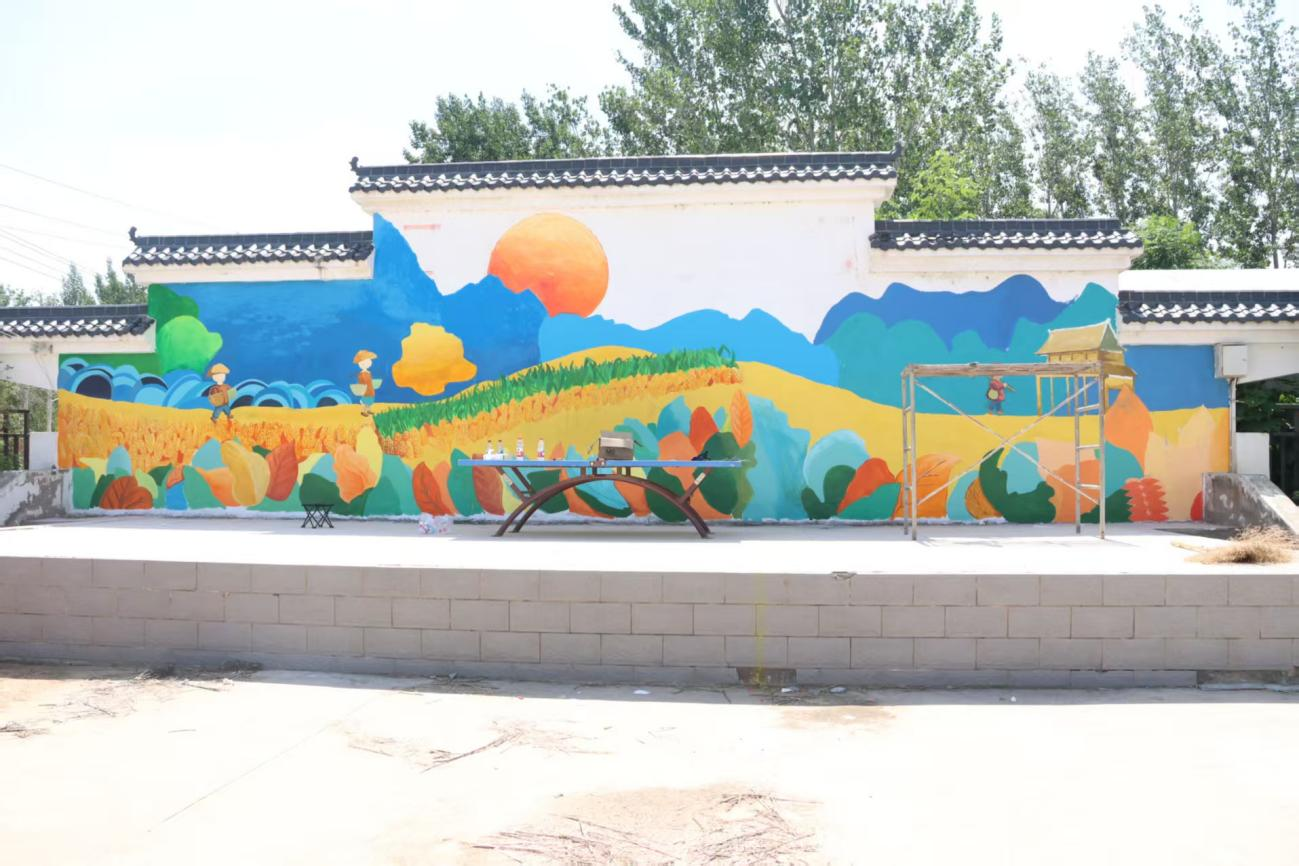 通过前几天的工作,团队成员已完成基本的绘图。从农作物纹理的精细勾勒,到田园图案的色彩微调,再到农作场景中人物神态的精准刻画,成员们以耐心和专业,让墙绘的每一处元素都更生动鲜活。经成员们细细打磨后,田园风光的灵动感、农耕文化的厚重感、乡村振兴图景的蓬勃感愈发凸显,墙面艺术感染力持续提升。