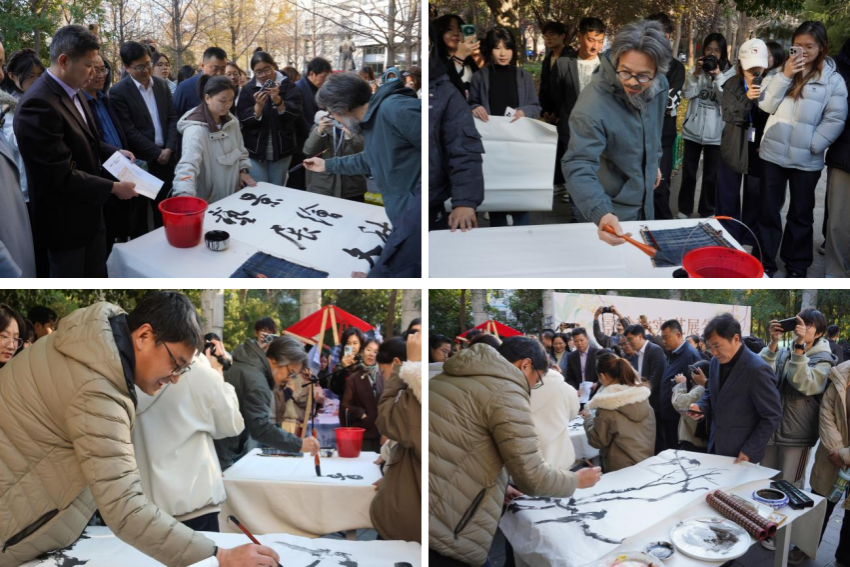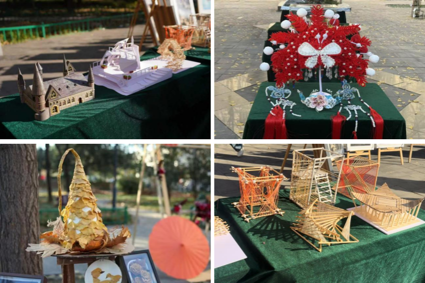 本次活动由艺术观赏区和互动体验区组成。在艺术观赏区,学院师生以银杏叶、果实等可持续材料为素材,制作了银杏帽、风铃、虎头等手工艺品和产品材料与工艺、植物景观等课程实践成果。学院教授、中国女画家协会会员、河南省美术家协会会员徐艳秋老师和学院副教授、河南美术家协会会员郭璐妍老师的《花卉静物》《布道者》《逝》《夏天的鱼》等获奖作品在学校活动中展示,受到了师生广泛关注和一致赞赏。学院副教授、中国书法家协会会员、河南省书法家协会教育委员会委员杜旭光老师和副教授、河南省美术家协会会员、河南省国画家协会会员宁传华老师更是现场用笔、墨、纸、砚书写、绘画出一幅幅意蕴悠长的红叶主题画卷,将本次活动推向高潮。悄然中,学生的手工作品《扇间秋韵》杏叶秋弦》《叶里的小世界》《写给秋天的一封信》等在金色秋风中绽放,点缀着枝头的秋光的明媚与创作的鲜活,把观众引入了轻盈又治愈的秋日梦境中。学院教授孟滨老师和副教授王娜老师分别为与会领导介绍了现场展示作品的内涵及制作工艺。一件件作品精巧细致、立意深远、意蕴悠长,充分展现了两院师生深厚的艺术素养、扎实的专业功底、灵巧的手工技艺、丰富的想象力和学校深耕课程育人的实践成效。在互动体验区,我们给参与师生准备了投壶、漆扇、滴胶、集叶等丰富多彩的非遗体验活动。