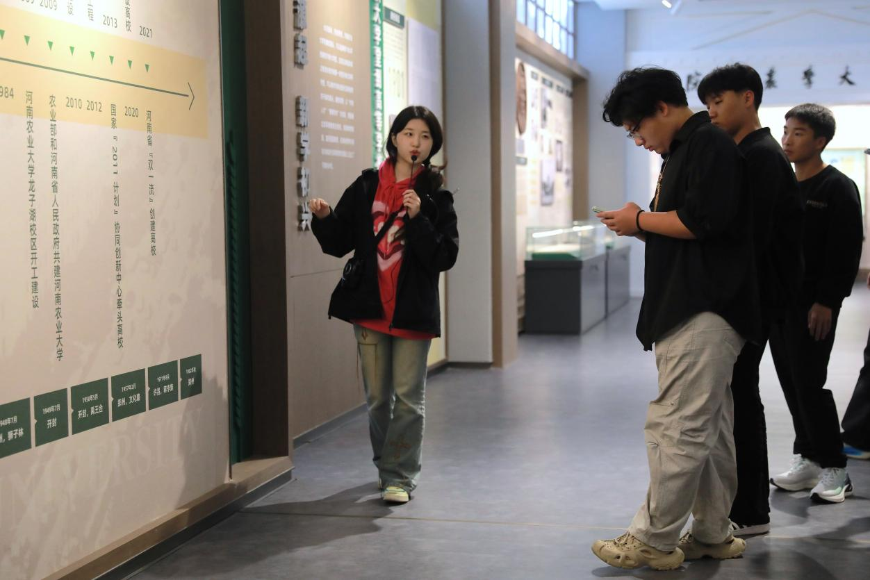 活动中,校史馆讲解员结合珍贵的实物展品、历史照片和文字资料,生动讲述了河南农业大学从建校至今的发展历程,详细介绍了学校建校一百年来的迁址和改名历程以及如今我校在农业科研、人才培养、社会服务等方面取得的突出成就。新生们认真聆听、驻足记录,在过程中逐渐加深对学校的认同感与归属感。