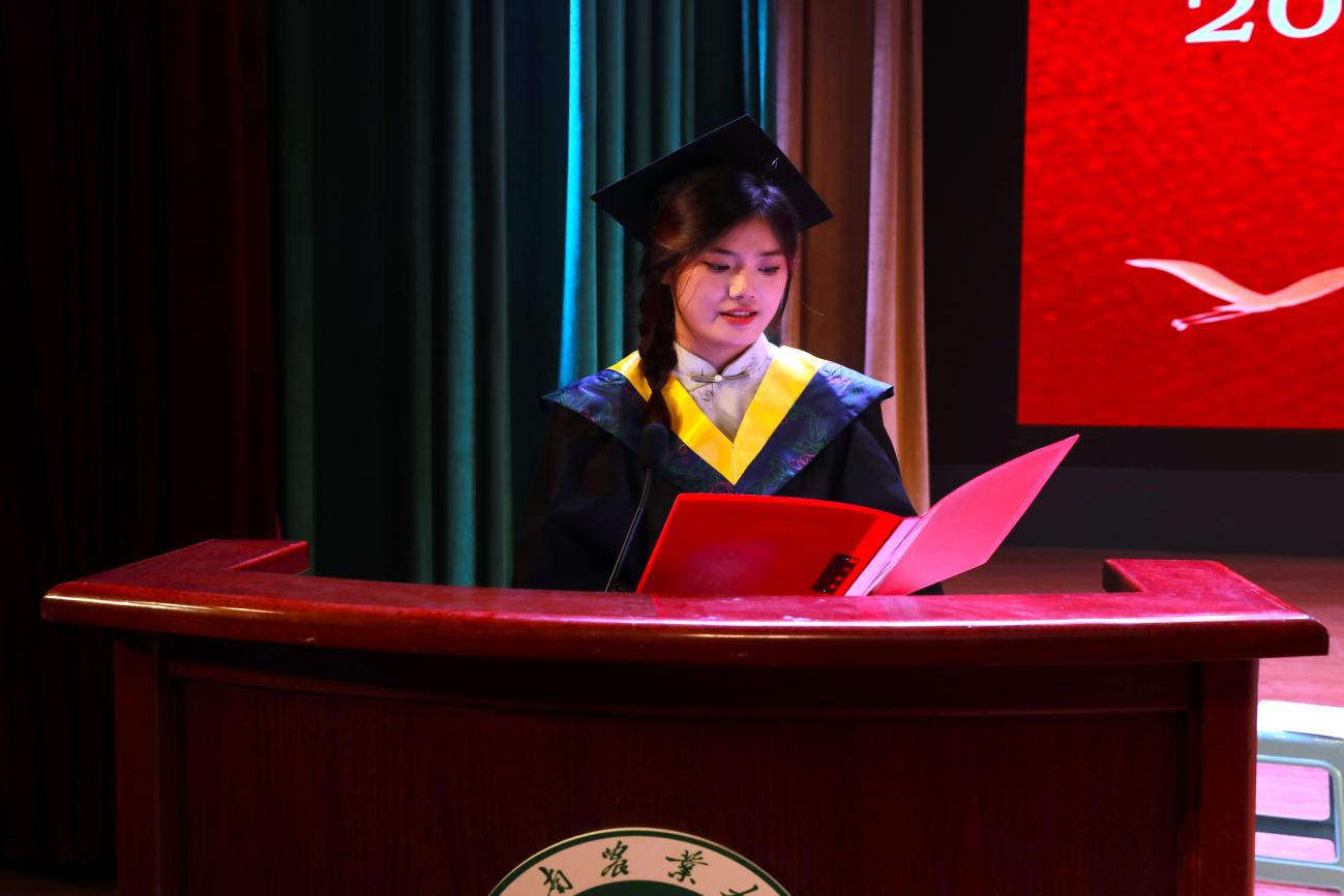 毕业生代表2021级风景园林2班毕业生赵婷同学发言。她深情回顾了在农大求学成长的珍贵时光,从课堂求知到实践探索,诚挚感谢学院领导的关怀指导与老师们的辛勤培育,并将最真挚的祝福送给全体毕业生,愿大家带着母校赋予的力量,奔赴各自的星辰大海。