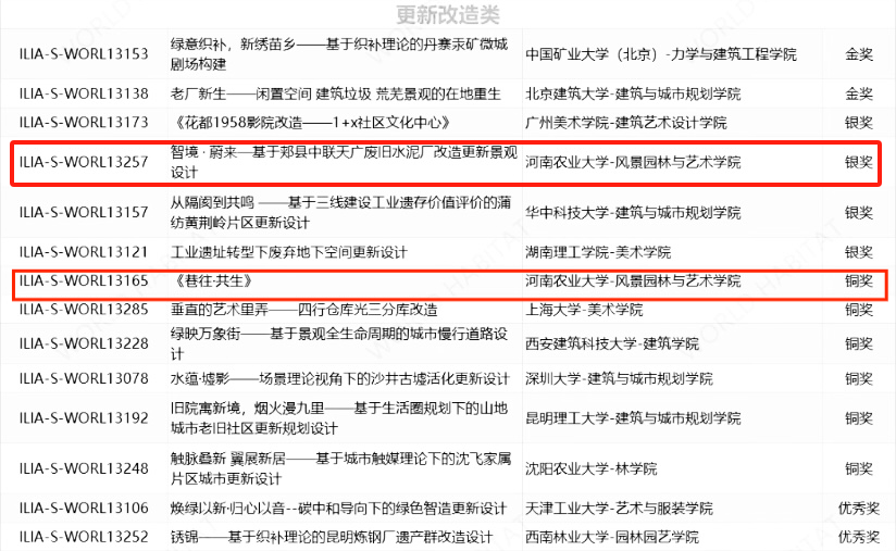 4月7日,2024-2025世界人居建筑与环境设计大赛(艾景奖)传来捷报,我院教师唐洁芳与学生易虹、李苏颖、陈文莉的团队设计作品《智境・蔚来——基于郏县中联天广废旧水泥厂改造更新景观设计》,获更新改造类银奖;教师冯艳与学生李扬、杜文超、刘雪莹、李胤哲、刘京雨的团队设计作品《巷往·共生》获更新改造类铜奖。
