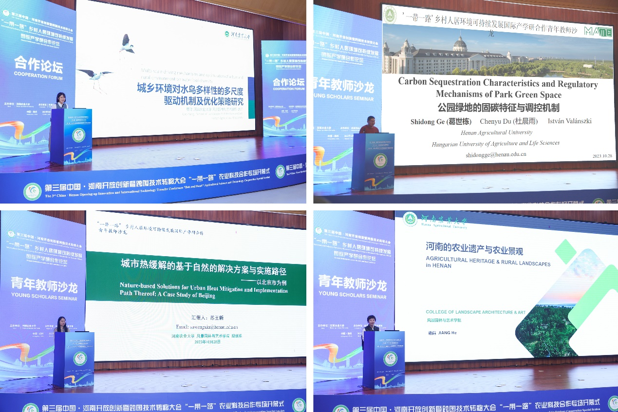 本次论坛旨在为青年教师提供一个展示自己科研成果、交流学术思想、接受专家指导的平台,提高青年教师的科研水平和创新能力。来自风景园林与艺术学院的4名青年教师曹洋、葛世栋、苏王新、蒋鹤分别就城乡环境对水鸟多样性的多尺度驱动机制及优化策略、公园绿地的固碳特征与调控机制、城市热缓解的基于自然的解决方案与实施路径、河南的农业遗产与农业景观等方面的研究内容进行了精彩的汇报。