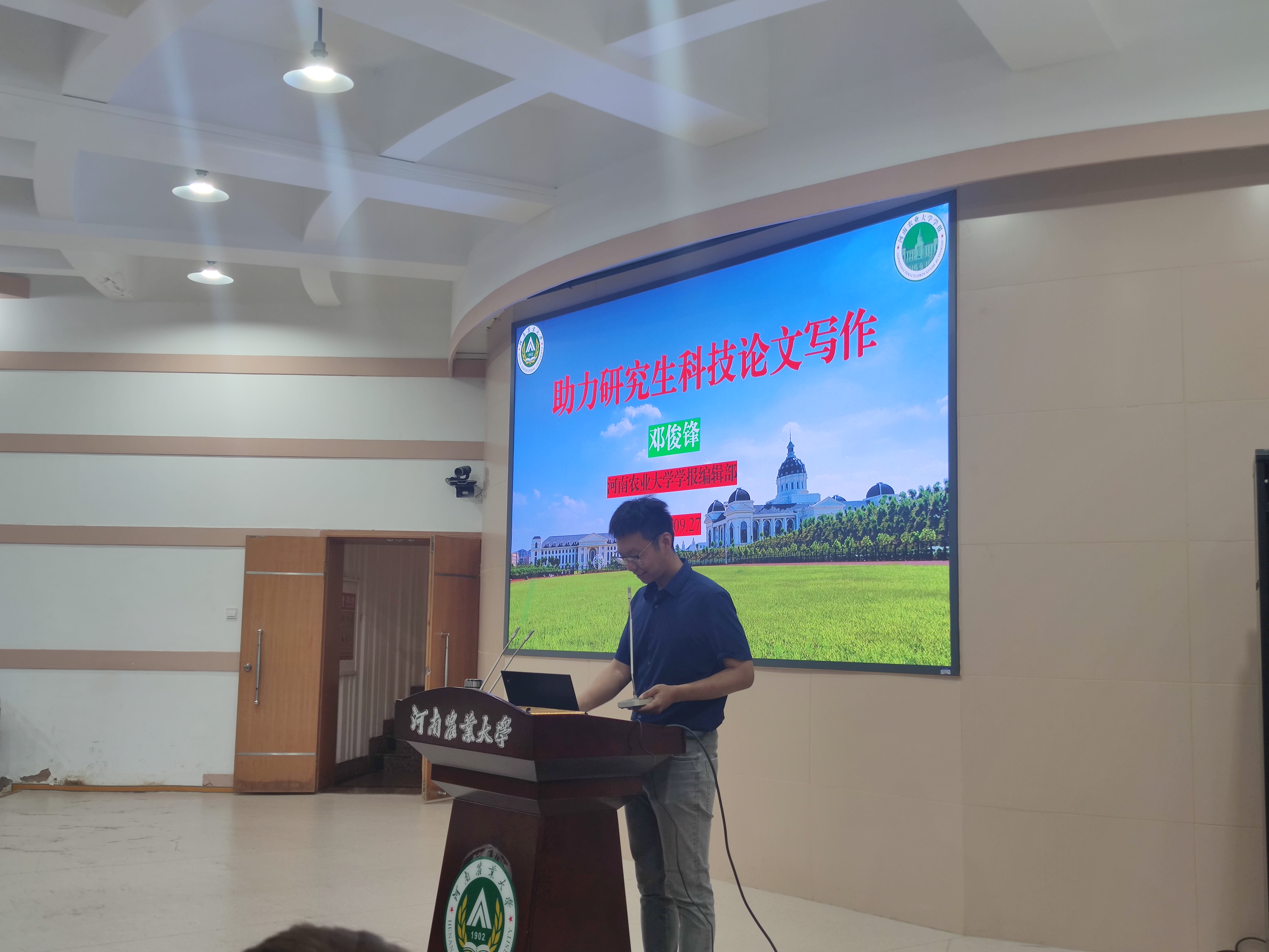 邓俊锋以“助力研究生科技论文写作”为题,围绕科技论文写作要点,论文的写作要求,论文目的及意义,如何做好科研,如何撰写好的论文等方面进行展开讲解。邓俊锋将论文写作与研究生生活相联系,并介绍河南农业大学学报的辉煌历史,对科研、论文写作和投稿等进行了全面剖析,重点讲述了论文的整体布局和构思。他详细介绍了论文的基本构成注意要点和投稿过程中的一些注意事项,使大家对文章从选题论文的写作到投稿到发表的过程有了深刻理解和感悟。