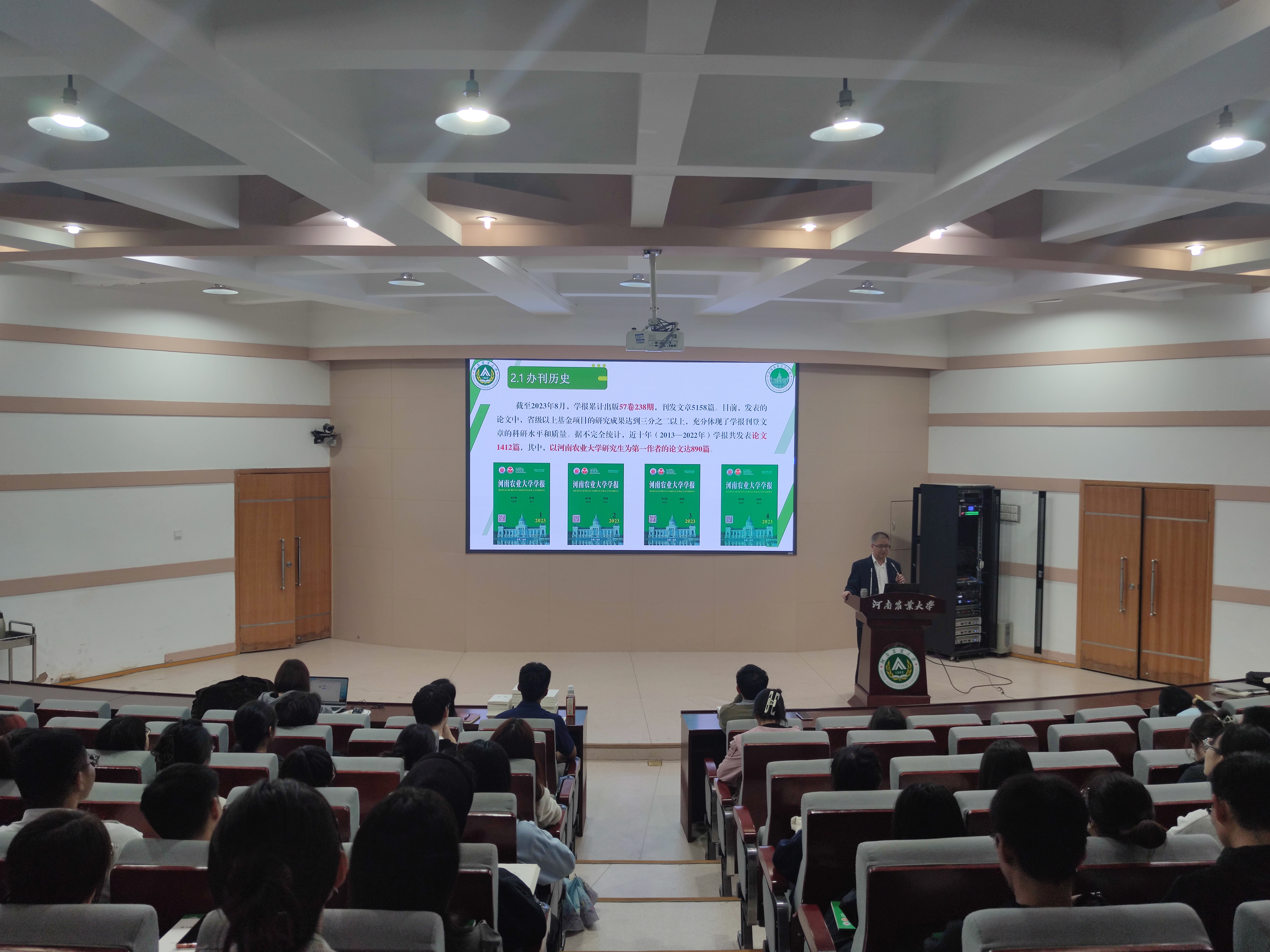 9月27日下午,由党委研究生工作部主办、风景园林与艺术学院承办的“两堂两坛”格致学术讲堂在文化路校区300人报告厅开讲,河南农业大学学报编辑部主任邓俊锋应邀为我校师生作报告。风景园林与艺术学院部分教师和22级、23级全体研究生参加报告会,会议由院党委副书记赵九阳主持。