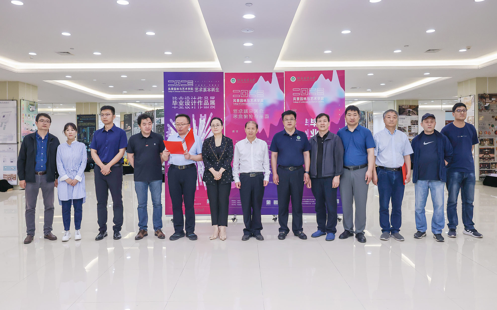 5月24日上午,河南农业大学风景园林与艺术学院艺术系2023届本科生毕业作品展开幕式在龙子湖校区图书馆三楼展厅举行。校长介晓磊及党委学工部部长徐峰、图书馆馆长张华、教务处副处长王金铎、学工部副部长张二龙、植物保护学院党委书记李兴道,风景园林与艺术学院党委书记侯永华、院长田国行、院党委副书记赵九阳,艺术系主任孟滨和艺术系全体教师、2023届全体毕业生出席开幕式。开幕式由侯永华主持。