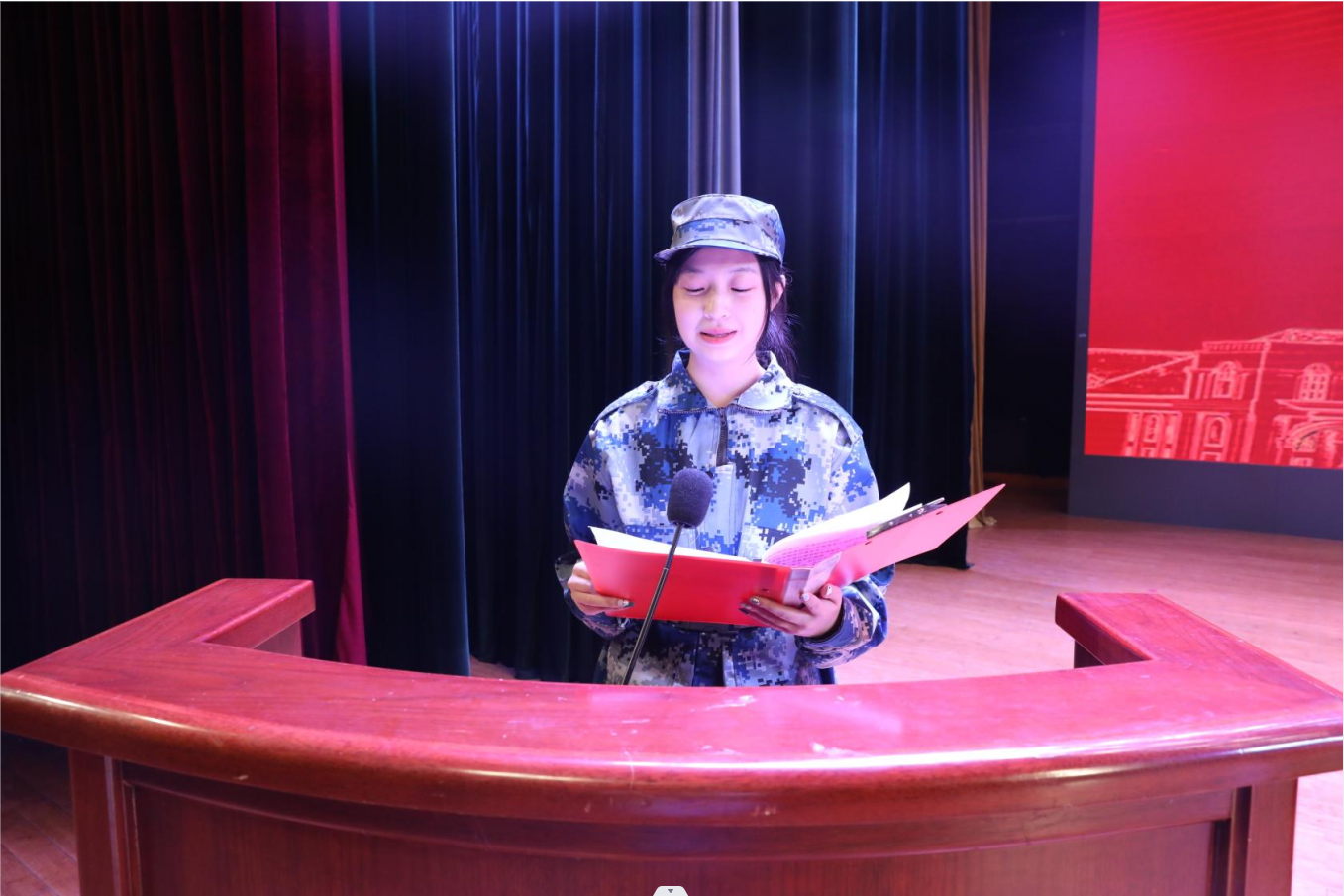 2022级设计学类5班李欣岩作为新生代表发言。她表达了对大学生活的美好向往与憧憬,积极号召全体新生奋发图强,迎难而上,为母校争光。