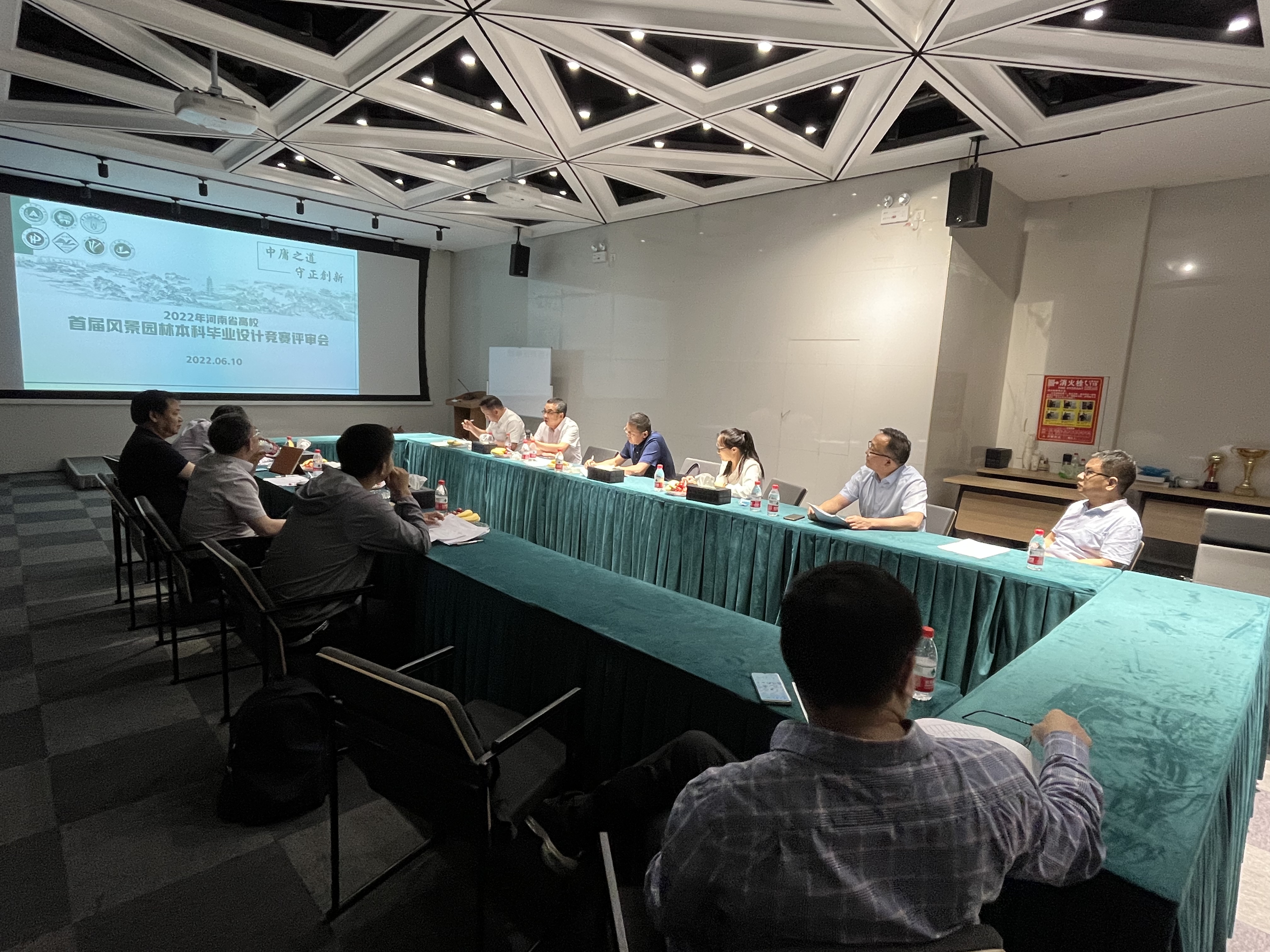 本次竞赛于2022年3月12日在农大景艺学院微信公众号发布竞赛通知,截止到5月6日,共收到省内7所高校作品111份;5月30日-6月5日,7所高校和6大设计企业分别选派一名专家成立专家评审委员会,完成专家初次匿名评审;根据专家打分,按照排名顺序选出入围作品50份进入6月10日的总决赛。总决赛采取线上和线下相互结合的形式,评审委员会主席由河南农业大学王鹏飞教授担任,评委为河南科技大学燕亚飞、河南理工大学张运兴、华北水利水电大学王旭东、河南科技学院毛达、许昌学院毕翼飞、河南城建学院甘陶冉等老师以及企业评审专家河南人禾景观设计有限公司总工李志超、郑州市市政工程勘测设计研究院总工林春阳、绿洲生态环境有限公司总工史屹峰、河南省景观规划设计研究院有限公司宋彦峰总工、河南省城乡规划设计研究总院股份有限公司高工穆占强、郑州绿之林文化传播有限公司工程师王瑞、北京自由创林景观规划设计有限公司高工吴修远。
