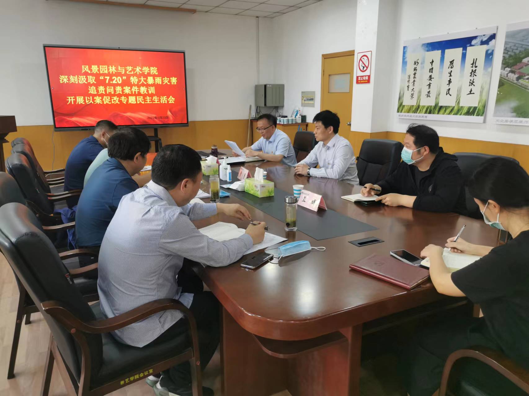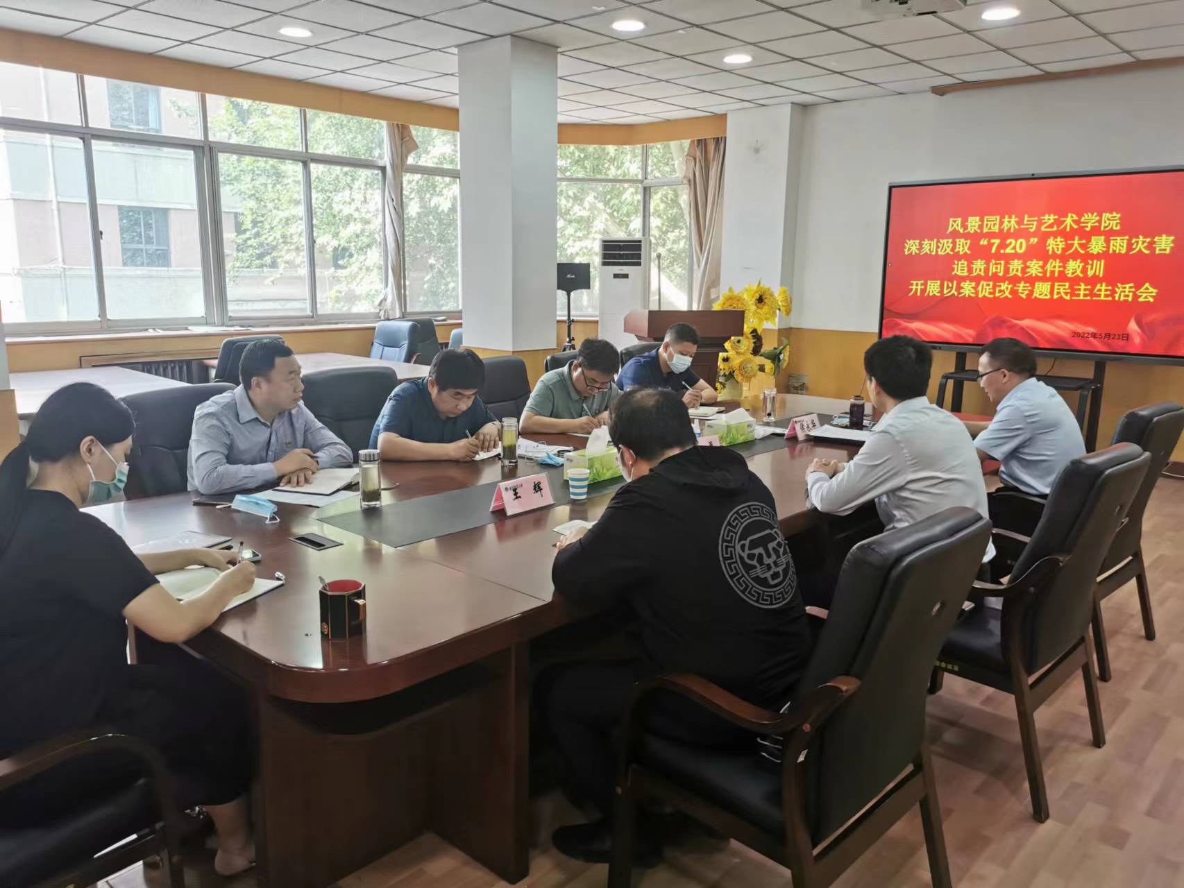 5月23日上午,风景园林与艺术学院在文化路校区13号楼第一会议室召开“7.20”特大暴雨灾害追责问责案件以案促改专题民主生活会。校党委组织部副部长董勇、校纪委第二纪检监察室主任王辉到会指导,院处级党员领导干部参加民主生活会。会议由院党委书记侯永华主持。