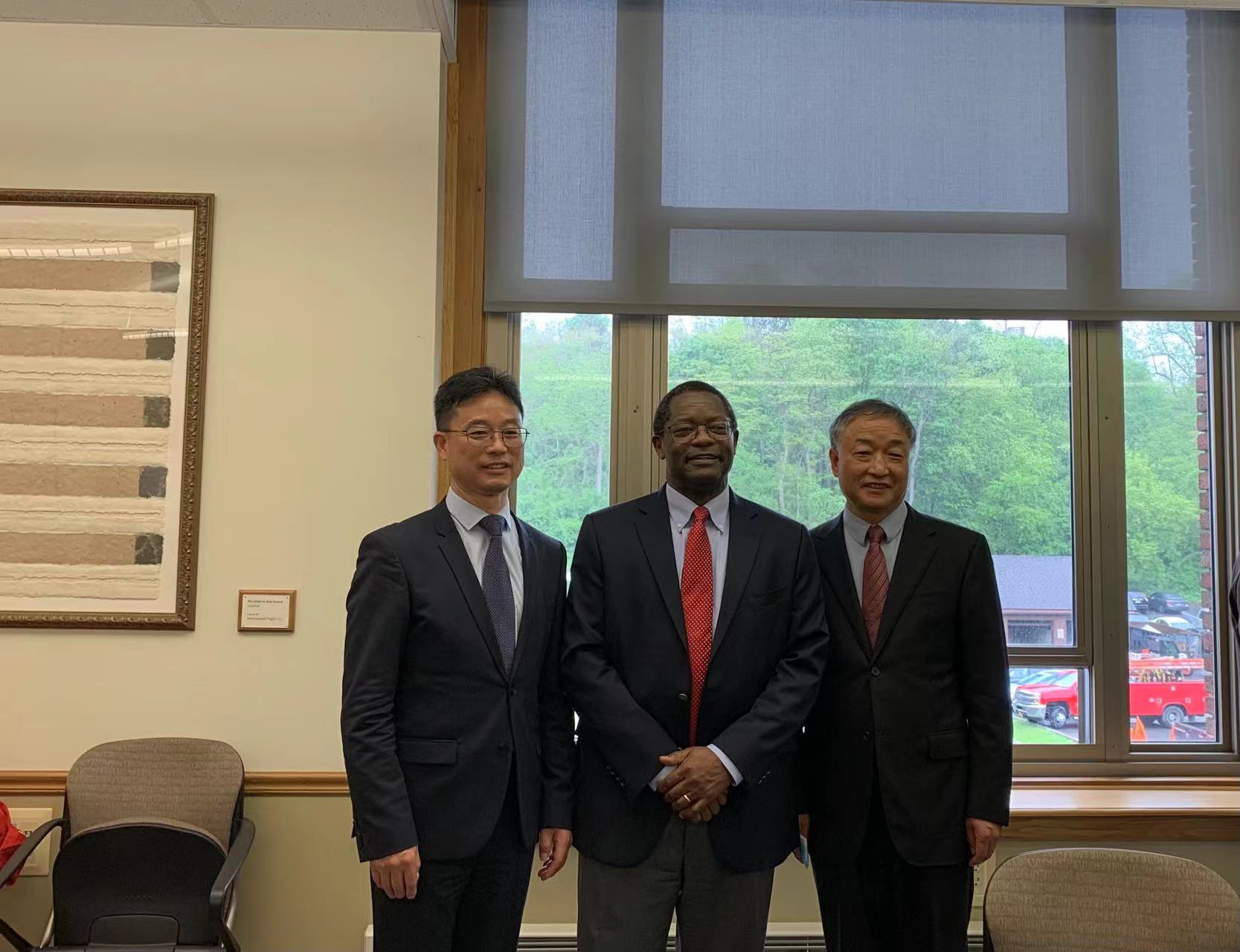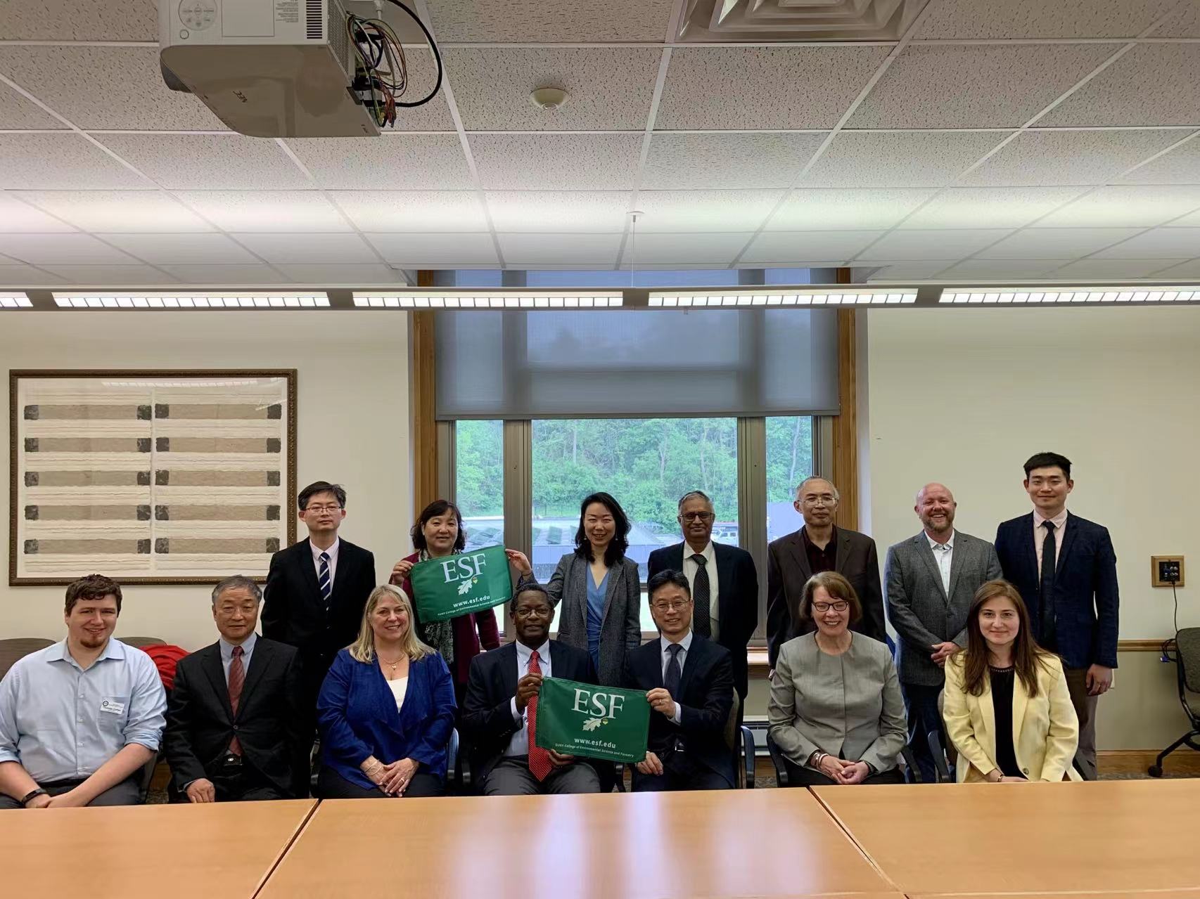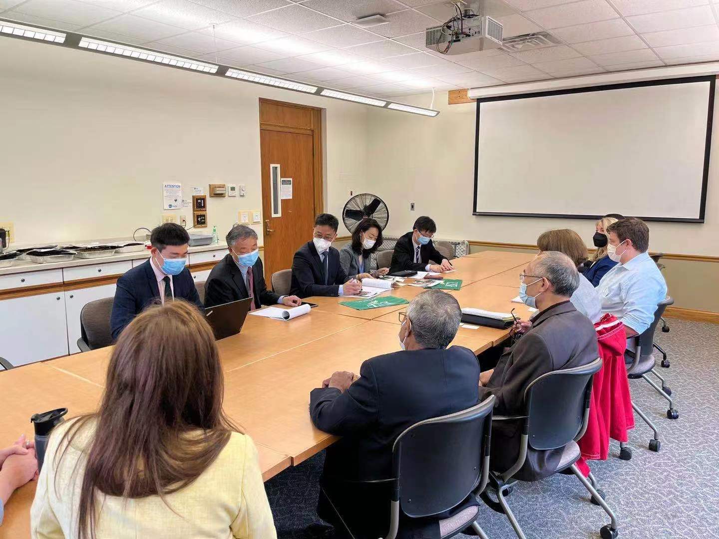 美国东部时间2022年5月19日上午,中国驻纽约总领事馆教育参赞杨军,秘书魏薇、王昆鹏一行调研我校与纽约州立大学环境科学与林业学院合作办学情况并召开座谈会,会议在雪城校区举行。院长田国行,美方执行校长兼教务长萨穆尔·莫卡萨、首席招生官兼副教务长凯瑟琳·麦卡锡、化学工程系主任邦达陆·拉玛崂、国际教育办公室主任托马斯·卡特、外语培训中心主任尼诺·杰哈出席会议,我院教师刘洋、美方风景园林系教师代表艾登·艾克曼、化学工程系教师代表刘世界、国际教育办公室协调员陈辉、凯里·芬德利参加会议。