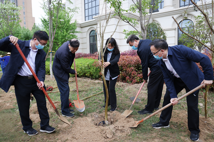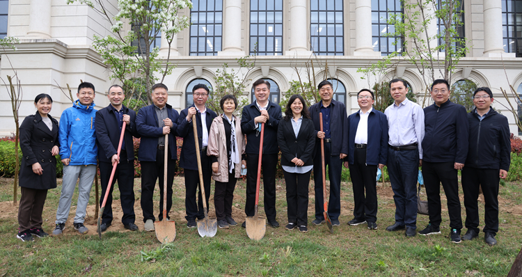 龙子湖校区图书馆前,大家挥锹培土,扶枝入坑,提水浇灌,在欢声笑语中,共同种下了对学校的深情厚谊和美好祝福。待到盛夏校庆日,书香花香相辉映,定会盛放红满堂。