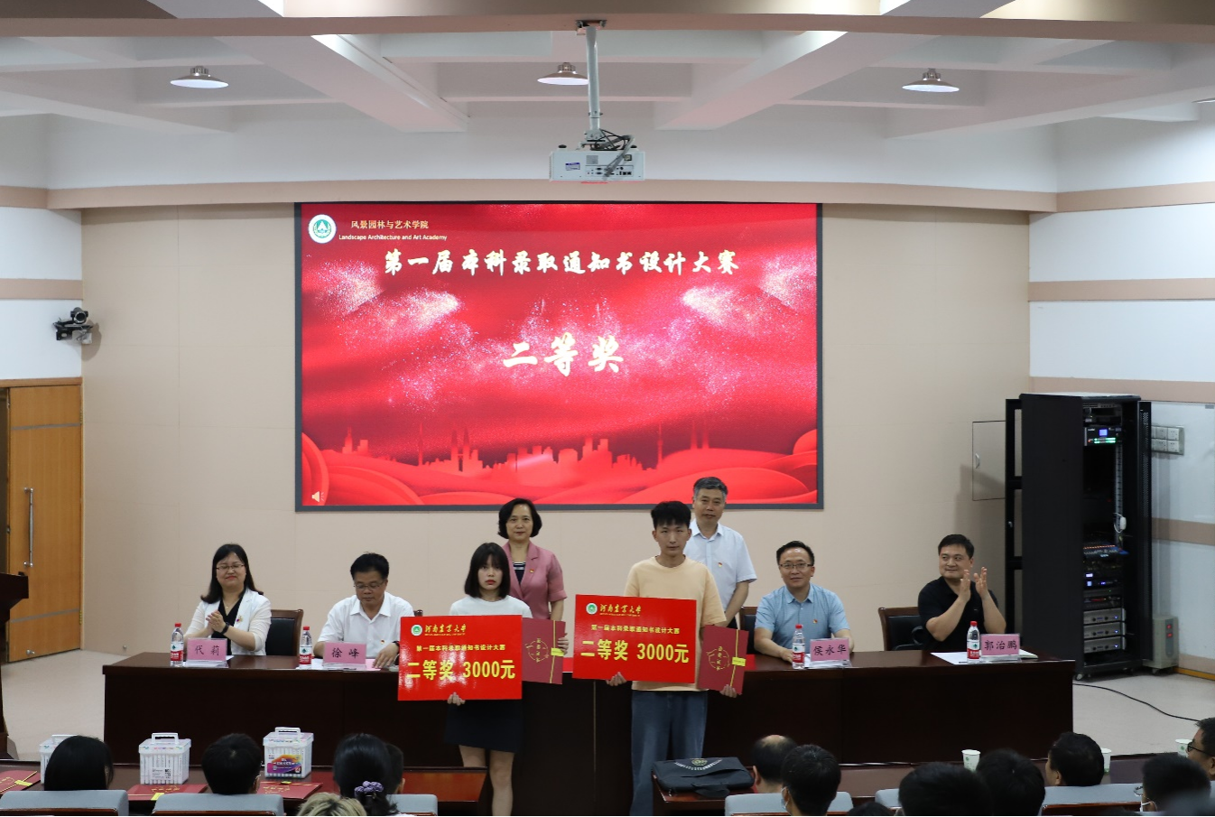 6月17日下午,河南农业大学第一届本科录取通知书设计大赛颁奖大会在文化路校区300人报告厅举行。河南农业大学副校长尹新明,校教务处处长、招生办公室主任冯建灿,校学生处处长、学工部部长徐峰,风景园林与艺术学院党委书记侯永华,校教务处副处长、招生办公室副主任代莉,校学生处副处长、学工部副部长郭治鹏出席大会。大会由冯建灿主持。
