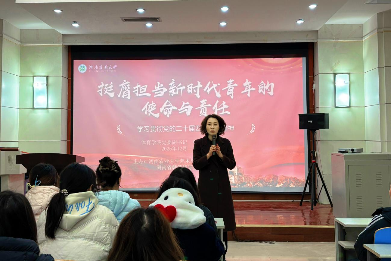 为深入学习宣传贯彻党的二十届四中全会精神,引领青年学子在强国建设、民族复兴伟大征程中挺膺担当,12月24日下午,我院在文化路校区校史馆一楼会议室举办“挺膺担当新时代青年的使命和责任”专题宣讲会。体育学院党委副书记韩笑应邀作报告,我院团委老师史玥、全体青马班学员和新发展团员参加。