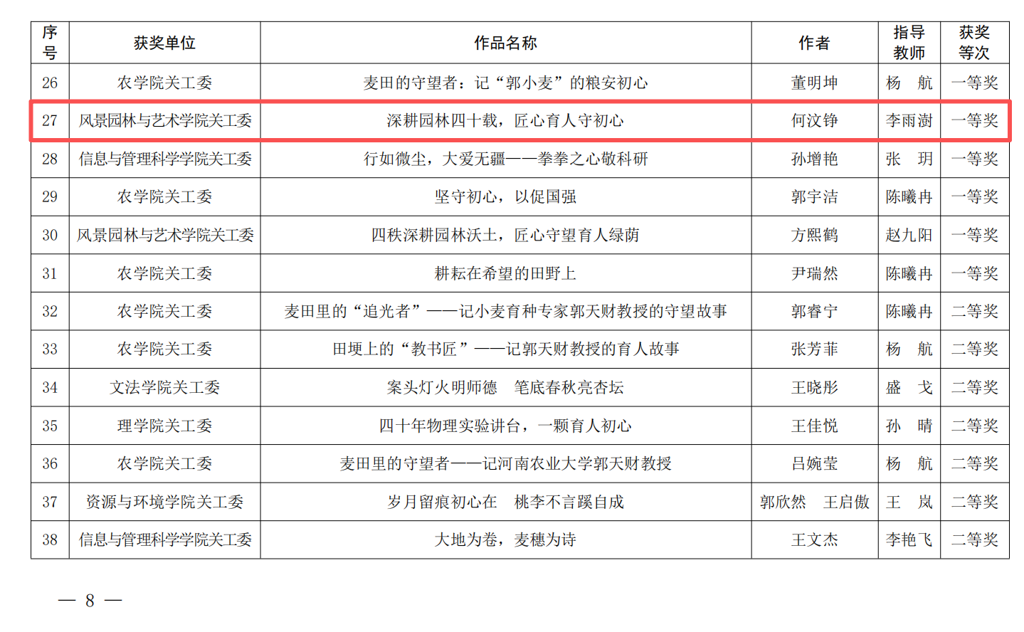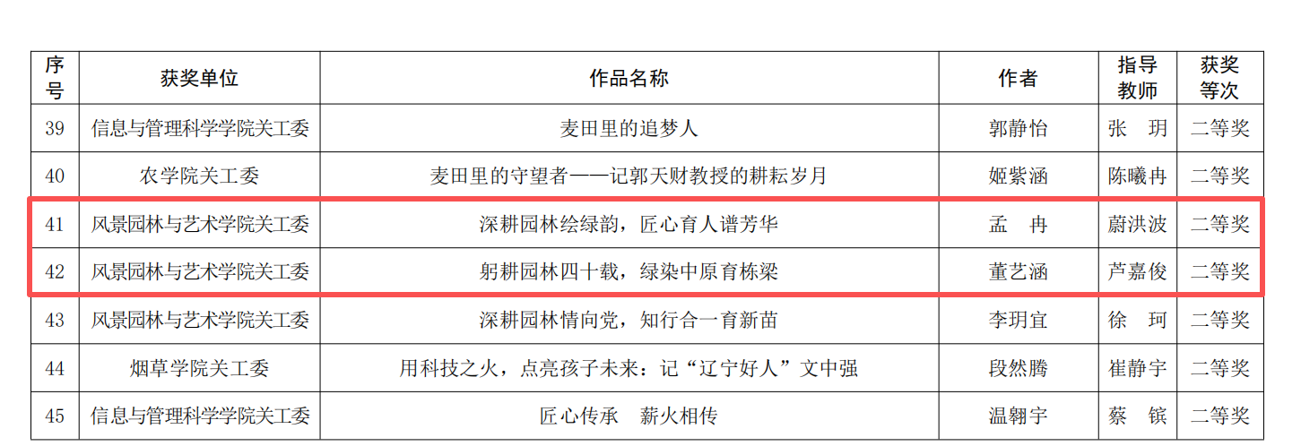 微视频组中,张笛佳、傅晓瑞、刘雨菲、祝慕琳的《深耕绿野育桃李,情系山河绘新章》荣获省级特等奖;王羿凯、李帅克、抄月欣、刘洋名的《读懂中国风景园林的时空对话》荣获校级二等奖。征文组中,石孟飞的《丹心映照育人路,不负霜鬓写春秋》荣获校级特等奖;何汶铮的《深耕园林四十载,匠心育人守初心》荣获校级一等奖;孟冉的《深耕园林绘绿韵,匠心育人谱芳华》以及董艺涵的《躬耕园林四十载,绿染中原育栋梁》荣获校级二等奖。