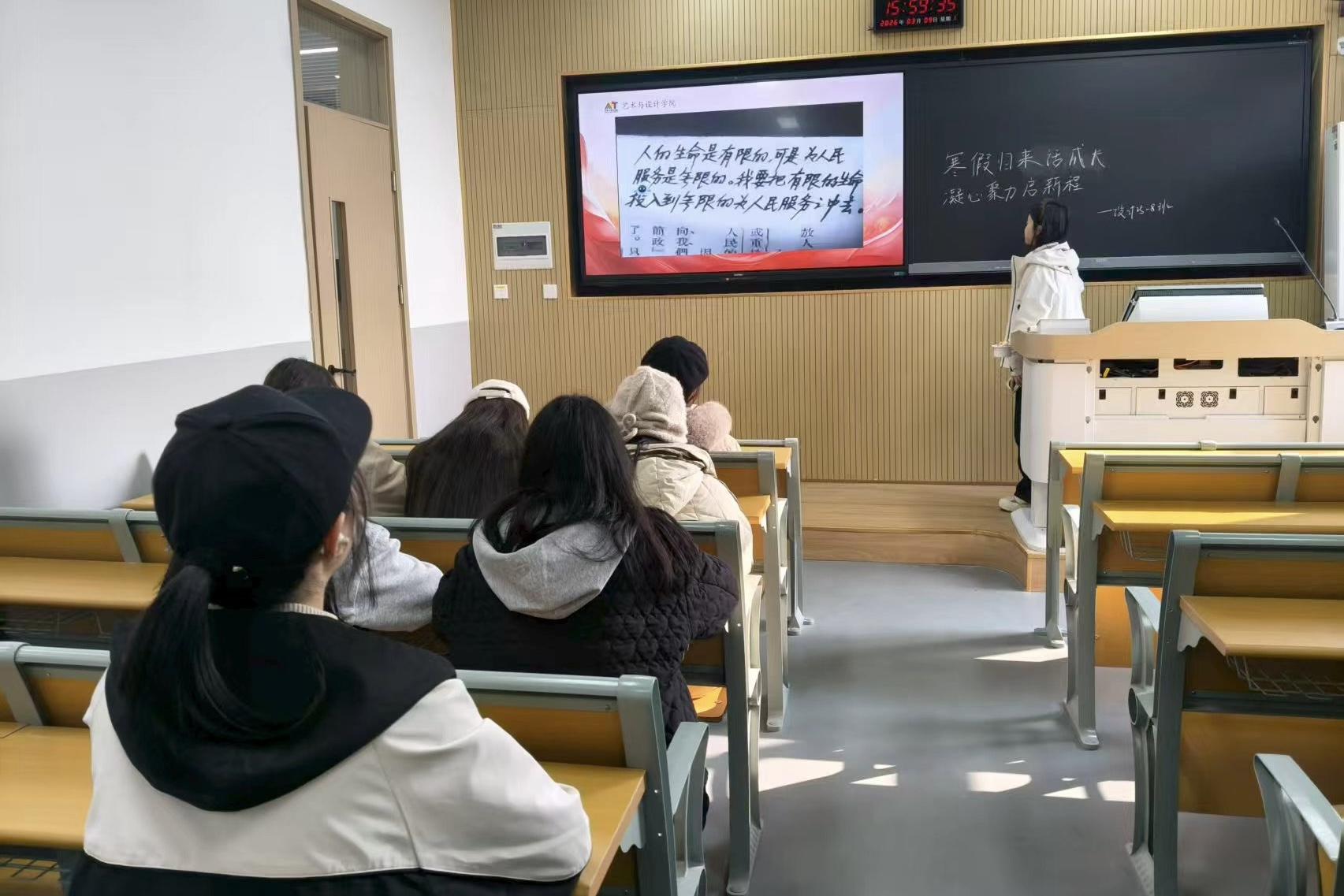 各学生班级纷纷以“分享 + 交流 + 沉淀”三维联动创新形式,让假期成长分享直抵心灵。在分享回顾环节,通过现场发言、假期成果展示、照片分享等,带领学生回顾寒假的实践经历、生活感悟与成长收获,设计25-6班以“身边的成长故事”为线索,鼓励同学们结合寒假家务劳动、家乡变迁观察、校园知识复盘等日常经历展开分享,让成长感悟更接地气。在交流探讨环节,“我的寒假成长”“新学期新目标”“班级聚力共奋进” 等话题引发热烈讨论,产品设计24-5班围绕“新学期专业技能提升计划”展开集体研讨,同学们结合假期学习短板,共同制定班级软件学习、设计竞赛备赛等集体计划;设计25-8班则聚焦“大学新生成长规划”,通过学长答疑、同学互动的形式,明确新学期学习、生活、实践的核心目标。全程同步留存班会照片,每位学生结合班会主题撰写发言稿与心得体会,在表达与书写中深化对假期成长的思考,凝聚班级向心力,筑牢新学期共同奋进的思想共识。