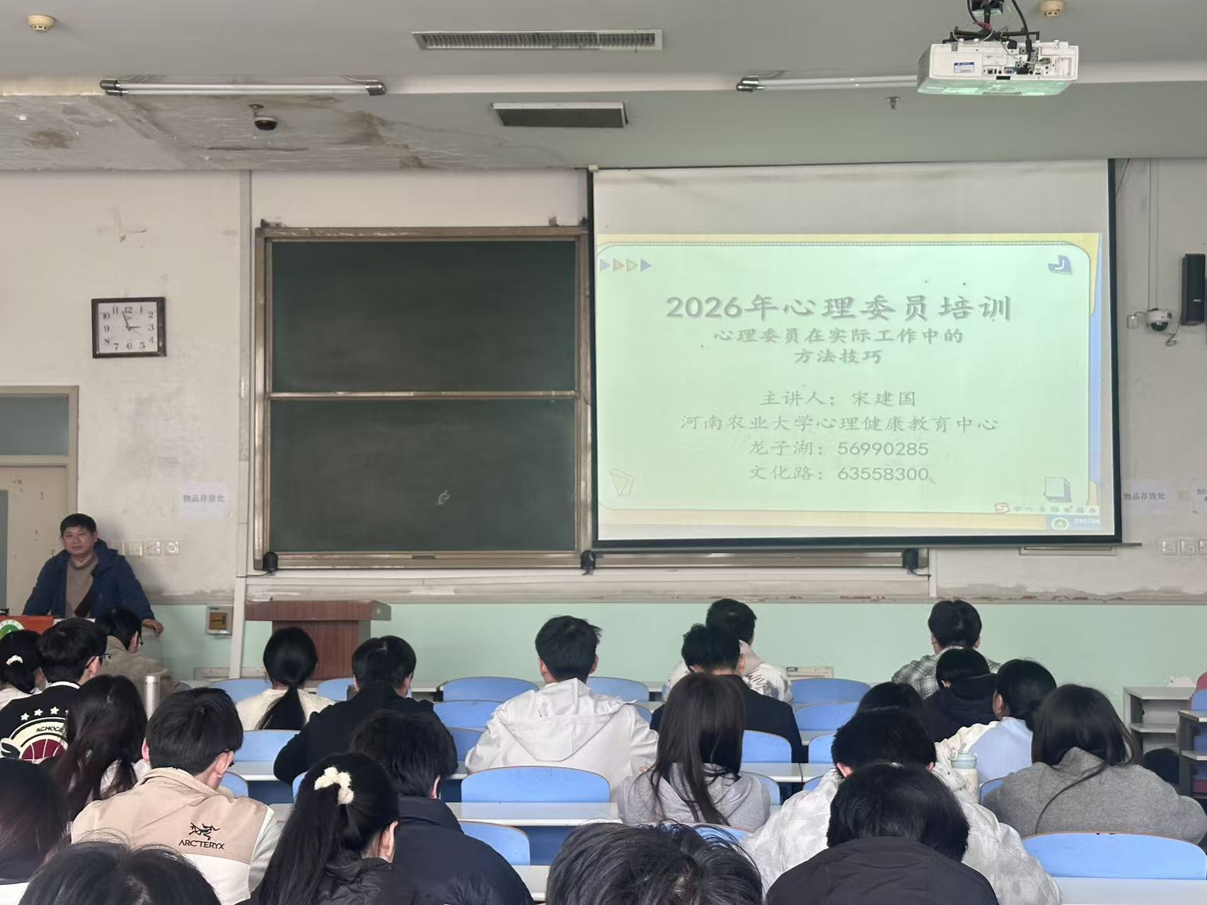 本网讯(通讯员:杨娜)为筑牢校园心理健康防护屏障,提升基层心理委员的危机识别与实务处置能力,3月24日下午,艺术与设计学院在文化路校区工程楼207教室开展2026年心理委员专题培训。本次培训特邀学校心理健康教育中心宋建国老师主讲,学院2024级全体心理委员积极参与、全员到场。