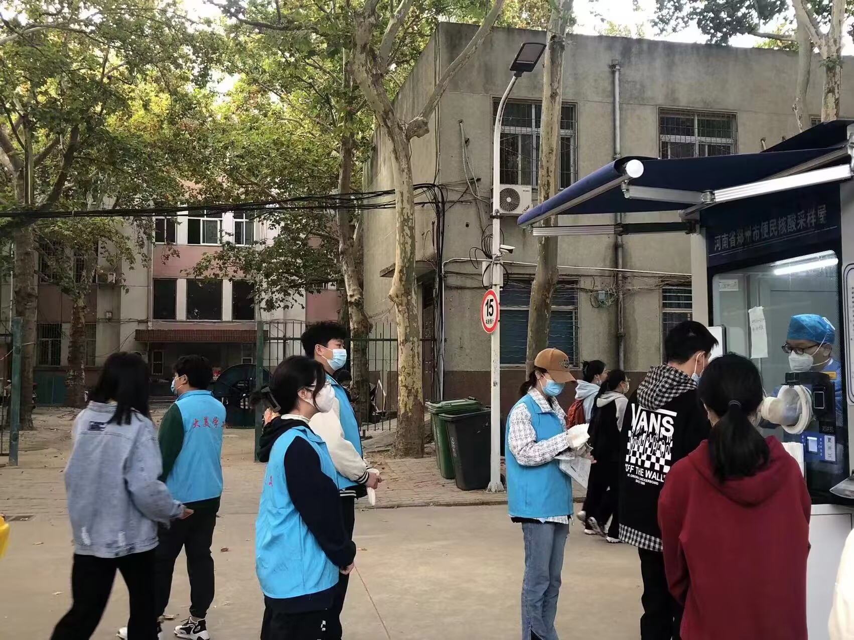 为进一步凝聚我院青年志愿者力量,为师生提供安全、稳定、有序的校园环境,我院师生志愿者于10月25日再次前往文化路校区核酸检测采样点开展志愿服务活动与校园巡逻工作。院党委副书记赵九阳,院团委老师芦嘉俊深入核酸检测现场,亲切慰问了志愿者们。