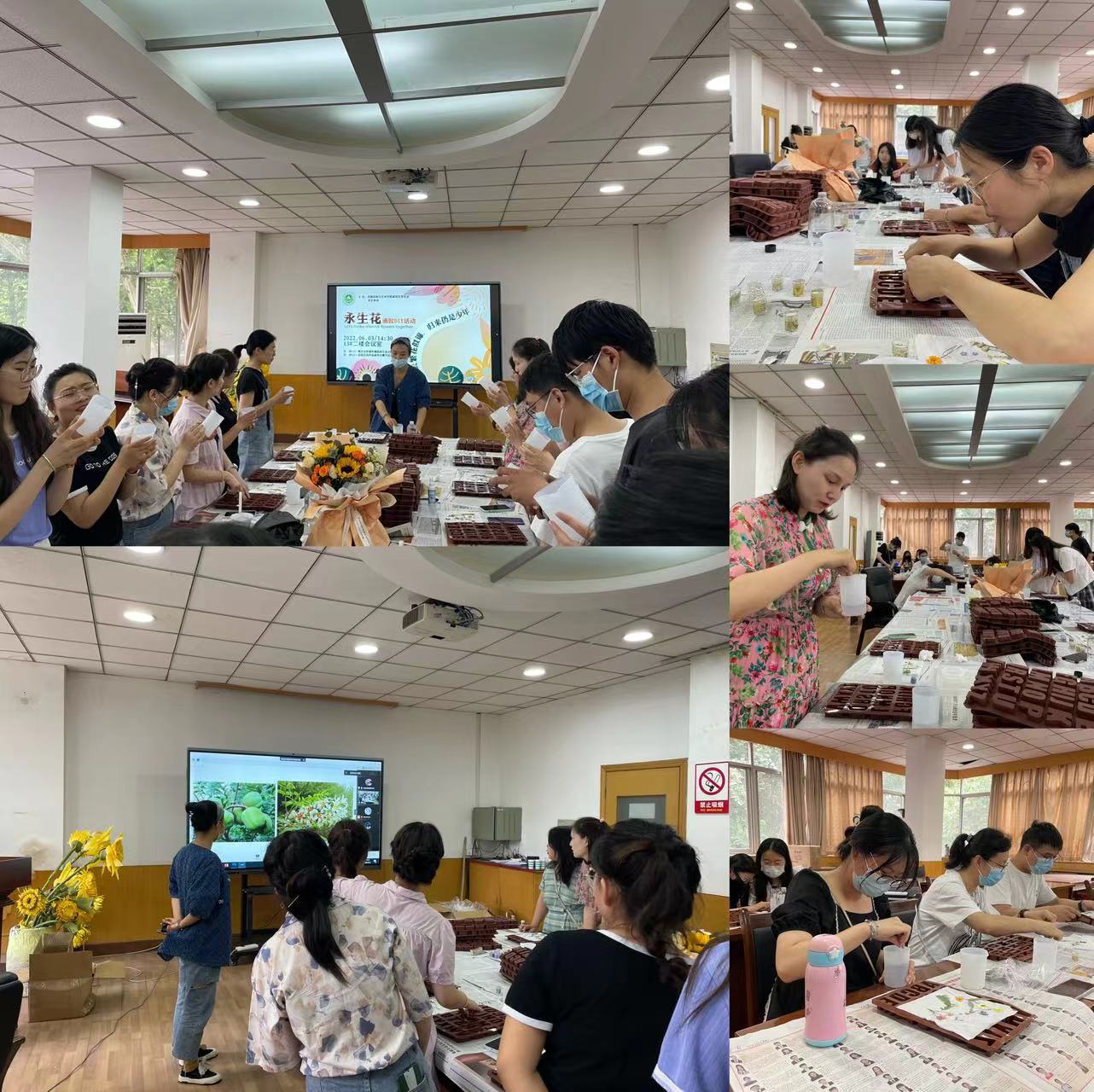 为加强毕业生与校院之间的联系,传承学院优秀的特色文化,6月3日下午,我院研究生会、花艺协会在13号楼会议室联合举办“此去繁花似锦,归来仍是少年”永生花滴胶DIY活动。教师代表石力匀、卫红、姚晓军、尚文倩、贺丹,研究生辅导员曹洋及40余名学生代表参加活动。