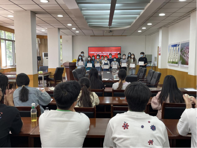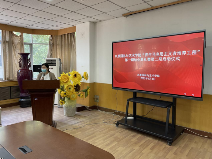 会议在庄严的国歌声中正式开始。院团委老师马焱宣读《风景园林与艺术学院青年马克思主义者培养工程第四期培训班结业学员名单》,院团委领导老师为结业学员颁发证书,并送上诚挚的祝福。第四期培训班优秀学员代表梁高铭结合自身的学习经历发言,期望下一届青马班学员在学习过程中树立远大理想,发挥好先锋模范作用。接着,王秋燕宣读《风景园林与艺术学院青年马克思主义者培养工程第五期培训班结业学员名单》。第四期培训班学员代表,2020级环境设计专业3班学生王宇佳上台发言,她表示,能够加入青马班是一件非常荣幸的事情,她将抓住机会不断坚定理想信念,提升思想觉悟。随后,芦嘉俊宣读了《风景园林与艺术学院2022年“青年马克思主义者培养工程”纪律要求》,希望青马班学员能够在学习中发挥带头作用,在思想上起精神模范作用。最后,徐珂对本次仪式做了总结发言,她勉励各位学员要坚持知行合一,在工作上严谨求实,认真负责,将坚定理想信念与加强理论学习结合起来,争做优秀青马人。