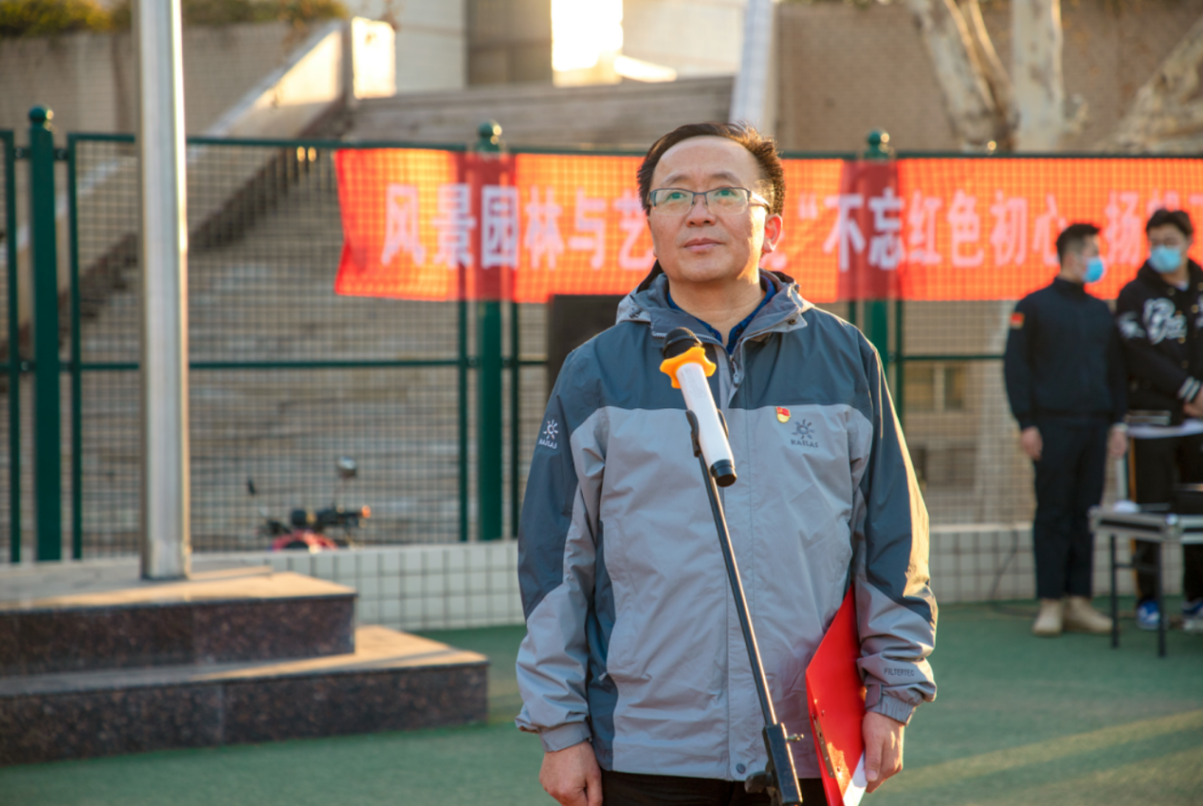 7时整,升国旗仪式正式开始。随着朝阳冉冉升起,国旗护卫队迈着铿锵的步伐走向国旗台。雄壮的《义勇军进行曲》奏响,全院师生肃穆而立,高唱国歌,庄严注视着鲜艳的五星红旗徐徐展开,向国旗行注目礼。院长田国行在升旗仪式讲话中强调,在建党一百年和建院一周年的重要节点上,景艺学院全体师生要学习英雄们对党忠诚、矢志报国的崇高品格和不怕困难、英勇顽强的战斗精神,厚植爱国主义情怀,勇担时代责任,以全新的面貌、昂扬的姿态迎接新的困难、攻破新的挑战,展现景艺风采,创造出新的成绩。学生代表,2019级环境艺术设计3班的、中国人民解放军火箭军96712部队退役复学的王雪梅同学深情发言,她首先分享了自己两年绿色军营的生活经历和成长收获;并倡议,作为新时代青年,要夯实专业基础、练就过硬本领,坚定理想信念、勇于担当,直面前进过程中可能出现的困难和挑战,为祖国的建设贡献自己的青春力量。
