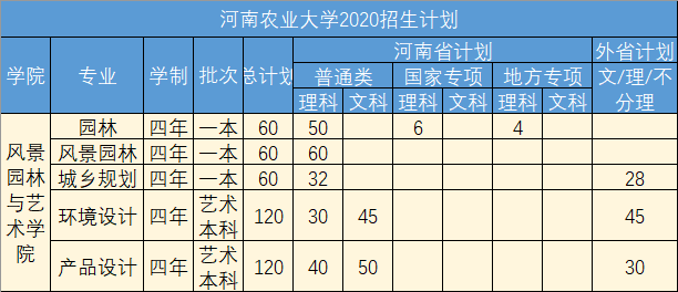 其中风景园林学为国家林业局重点学科和河南省一级重点学科,城乡规划、设计学2个校级重点学科。风景园林与艺术学院现有风景园林、园林、城乡规划、建筑学、环境设计及产品设计6个本科专业,涵盖农学、工学、设计学三大学科门类,其中园林专业为国家级特色专业、国家卓越农林人才教育培养计划改革试点-拔尖创新型专业和河南省一流本科专业建设点。风景园林与艺术学院是河南省唯一一家具有本科、硕士、博士、博士后各级风景园林专业人才培养平台的教学科研单位。目前,在校研究生和本科生1700余人。